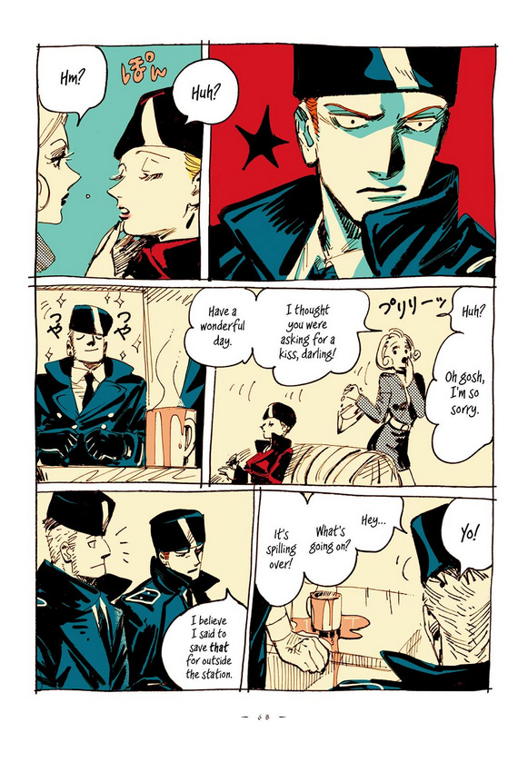 That is Veil. Its two main characters, Emma and Aleksander, don’t even get name introductions until their title cards at the end of the first volume. It doesn’t matter; they never use each other's names. She is blind and works doing desk work at the police station. He is a policeman at the same station. She is beautiful and has many clothes from her rich upbringing. He’s beautiful too, and he smokes (of course he does) and has a very anime-ish zany sprig of nape hair. To give you an example, a whole chapter can entail an incident of her losing her ring and him finding it for her. Like I said, it doesn’t matter as much as the visual component—the art.